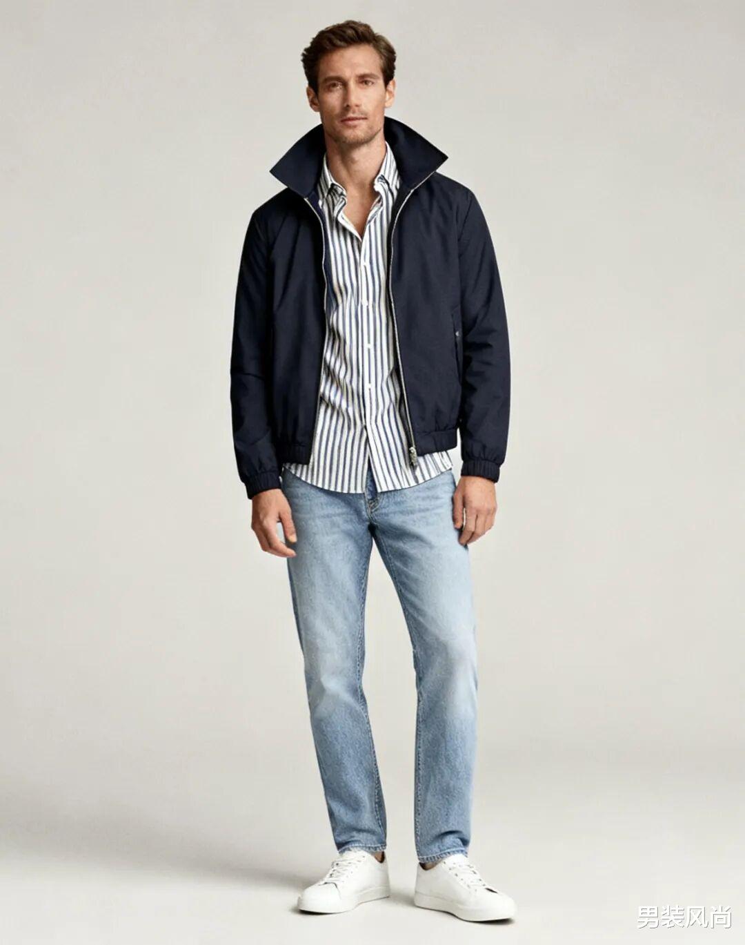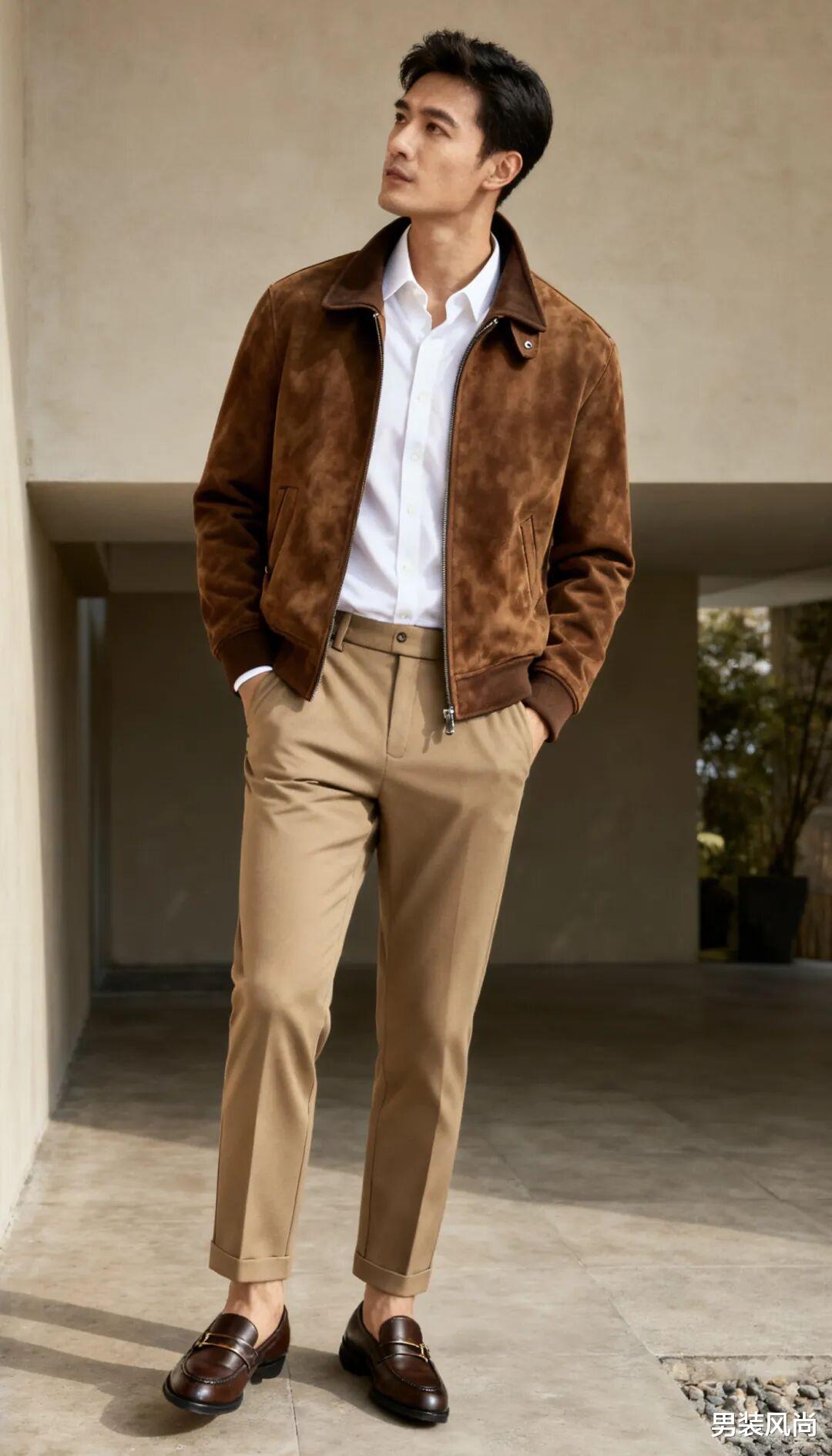 职场穿搭最怕“用力过猛”,立领夹克刚好平衡了正式与休闲。内搭选浅灰色或浅蓝色衬衫,衬衫领口解开一颗扣子,避免拘谨;下装搭配深色直筒西裤,裤脚长度到脚踝上方1厘米,露出一点点袜子边缘,比全长西裤更显利落;鞋子选一双黑色德比鞋或乐福鞋,再拎一个简约的皮质公文包,整体造型既有职场人的专业感,又比传统西装多了几分松弛。