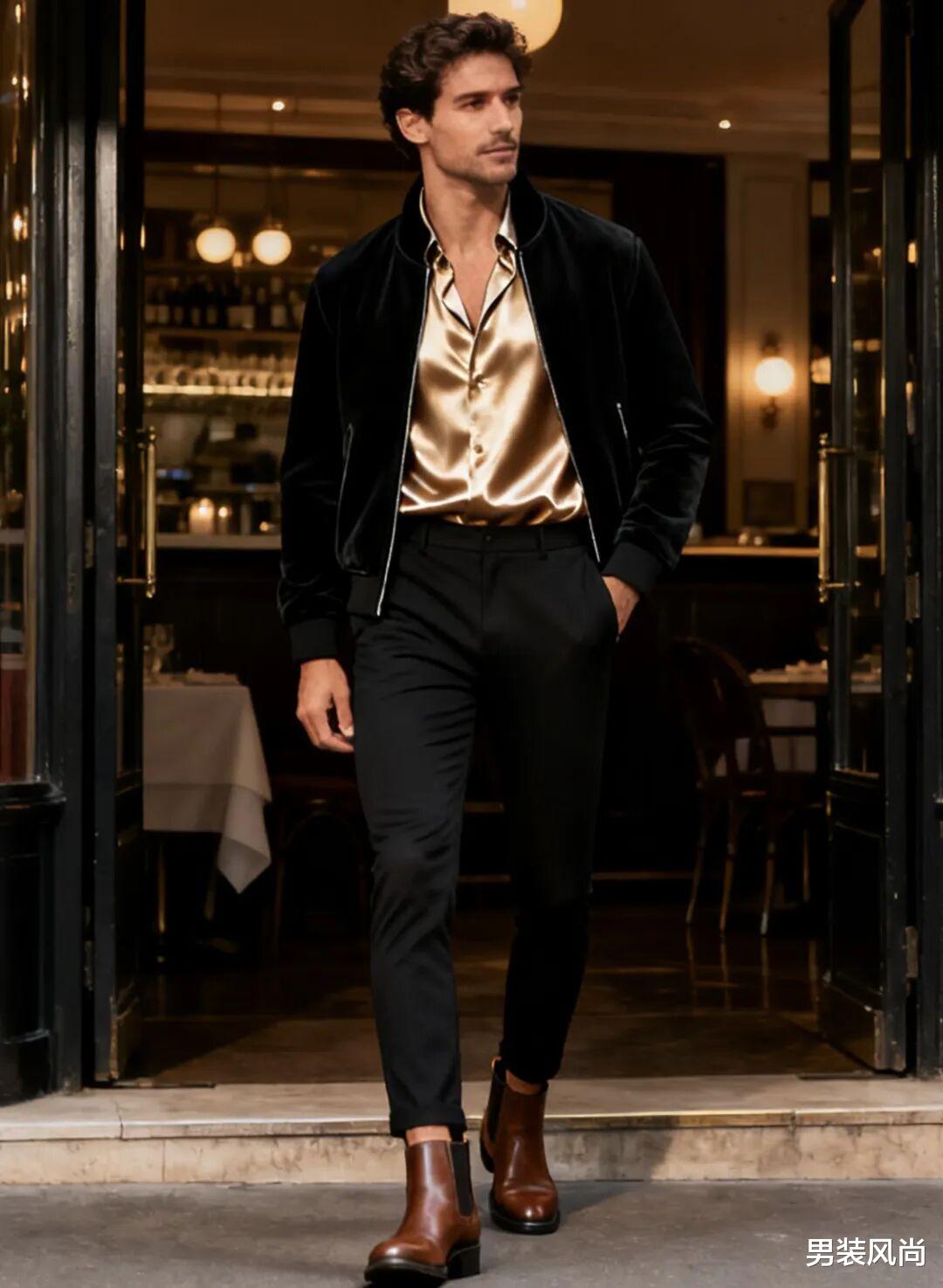 和女生约会,穿搭要“显用心但不刻意”。立领夹克的搭配可以往“精致休闲”方向靠。内搭选薄款缎面衬衫,香槟色或深酒红色都很有质感,衬衫下摆塞进裤子里,拉高腰线;下装选黑色修身休闲裤,裤子面料选微弹的,保证舒适度的同时不显得臃肿;鞋子选一双棕色切尔西靴,靴筒刚好卡在脚踝处,显腿长又精致。