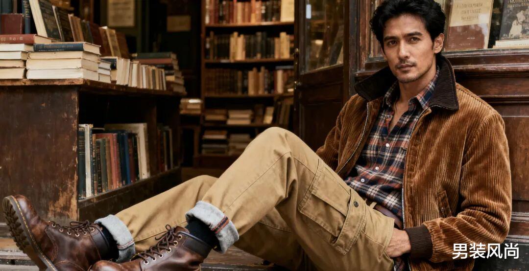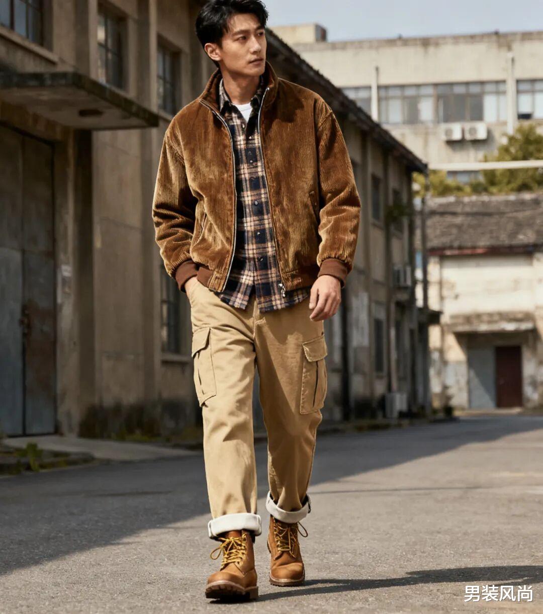 喜欢复古风的话,试试“灯芯绒立领夹克+格纹衬衫+卡其色工装裤”的组合。灯芯绒的纹理和格纹衬衫的复古感呼应,卡其色工装裤的裤脚微微卷起,露出马丁靴的靴口,整体色调统一在大地色系里,既有复古氛围,又不会显得杂乱。