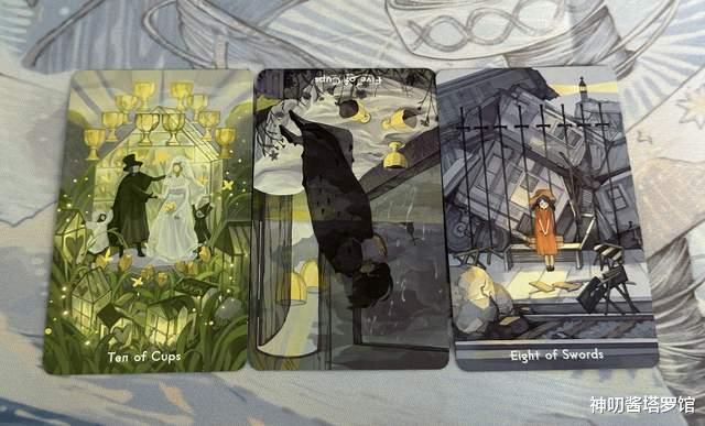 牌:圣杯十+ 圣杯五- 宝剑八+