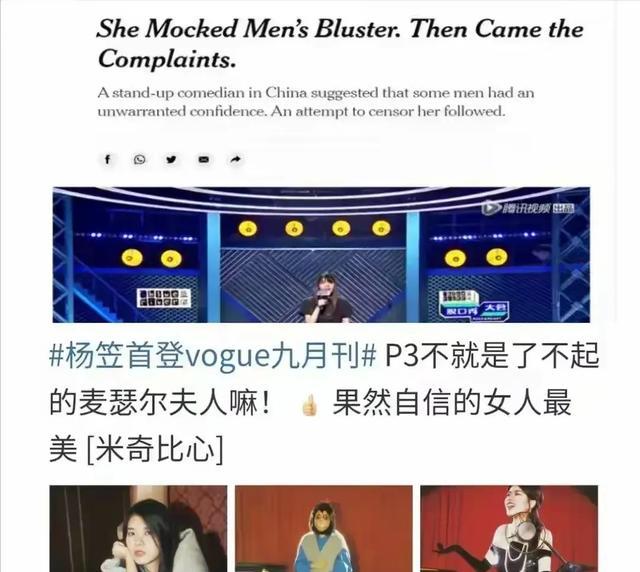 BBC、《纽约时报》等西方主流媒体纷纷将目光投向了这位中国脱口秀演员,并毫不吝啬地为她贴上了“女性权利斗士”的标签,将其推上了《Vogue》的封面,成为了西方世界眼中中国“女性觉醒”的代表人物。
