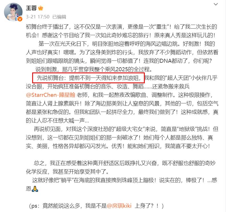 当《乘风2025》播出,王蓉在自己的社交账号发出一条消息,给网友们透露出一个重要信息,这个消息是:王蓉提前不到一天得知来参加《浪姐》,接到消息后,王蓉就开始准备舞台,她和自己的“潮人天团”小伙伴几乎没合眼,而初舞台的呈现效果,他们是非常满意的。
