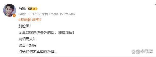 就在赵丽颖被这谣言搞得焦头烂额的时候,她的好友马锐站出来了。马锐作为明星造型师,在娱乐圈里也有一定的人脉和影响力。他和赵丽颖想必也是交情匪浅,看到好友被这样无端抹黑,心里肯定不好受。所以他才在社交账号上果断发文,直接表明“别尬黑!真相无人知,谣言四起传,拒绝任何不实消息散播。”他这话说得很明白,就是告诉大家,在没有确凿证据之前,不要随便跟风黑赵丽颖,那些说央媒批评她演技的消息,根本就是没有根据的谣言。