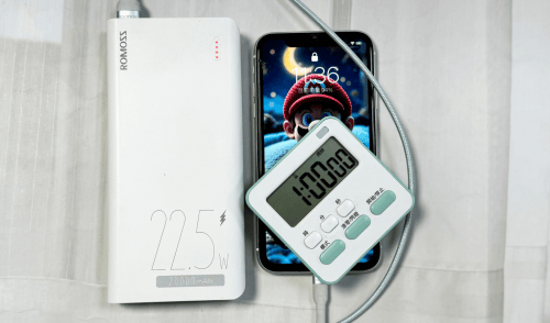 罗马仕这款充电宝需要自带数据线进行使用,最高支持20w充电。在实测中,30分钟可将手机电量从1%充至50%,充到60分钟时电量提升至99%,整体来说充电效率是还不错的。
