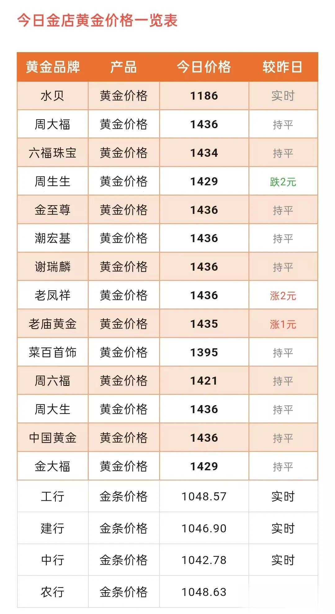 剩余其它品牌黄金价格同昨天黄金报价,保持一致。