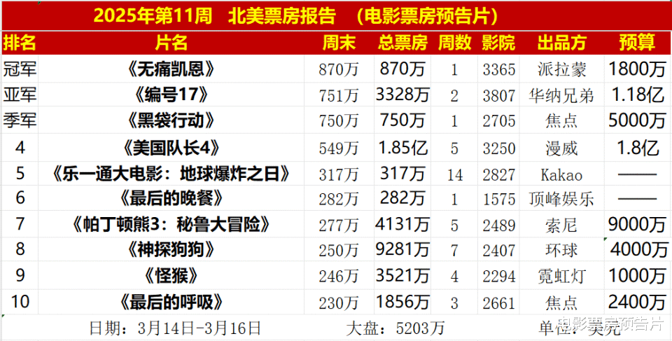 2025年第11周,3月14日至16日,北美大盘共计轰下5203万美元,创下今年最惨纪录,连超级碗周末那让人影院空荡荡的5400万美元都显得高不可攀。