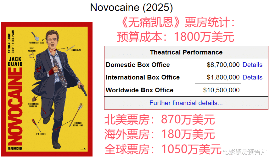 这部由杰克·奎德主演的动作喜剧《无痛凯恩》,首周末票房报收870万美元。乍一听还行,但别急着鼓掌,这可是自大流行以来最拉胯的首周冠军之一,您说这个冠军尴尬不?