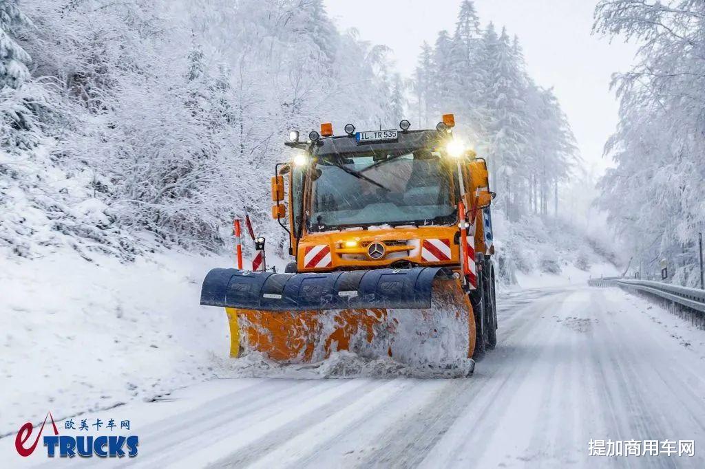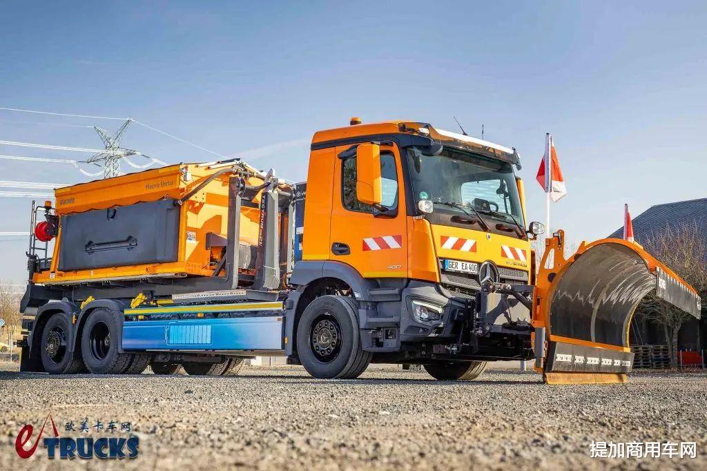 小车说完,接下来聊聊大车。在本届Demopark 2025展会上,奔驰带来了eActros400冬季维护卡车。这款车型前部配备推雪铲、车身借助拉臂钩系统搭载融雪剂播撒系统,主要用于冬季道路维护工作。