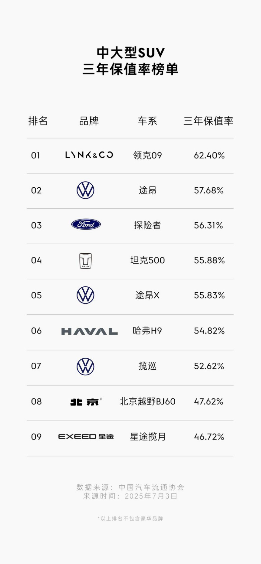 在日益理性的汽车消费市场,保值率已成为衡量一款车型综合实力与长期价值的关键标尺,它深刻影响着消费者的购车决策与资产规划。近日,中国汽车流通协会与精真估联合发布的《2025上半年中国汽车保值率研究报告》揭晓,在中大型SUV这一竞争激烈的细分领域,领克09以高达62.40%的三年保值率傲视群雄。这一亮眼成绩不仅确立了其细分市场的价值新标杆,更引领了“理财型SUV”的消费新潮流。其背后,是领克09对用户需求的精准把握以及在产品研发、技术创新上的深厚积淀。