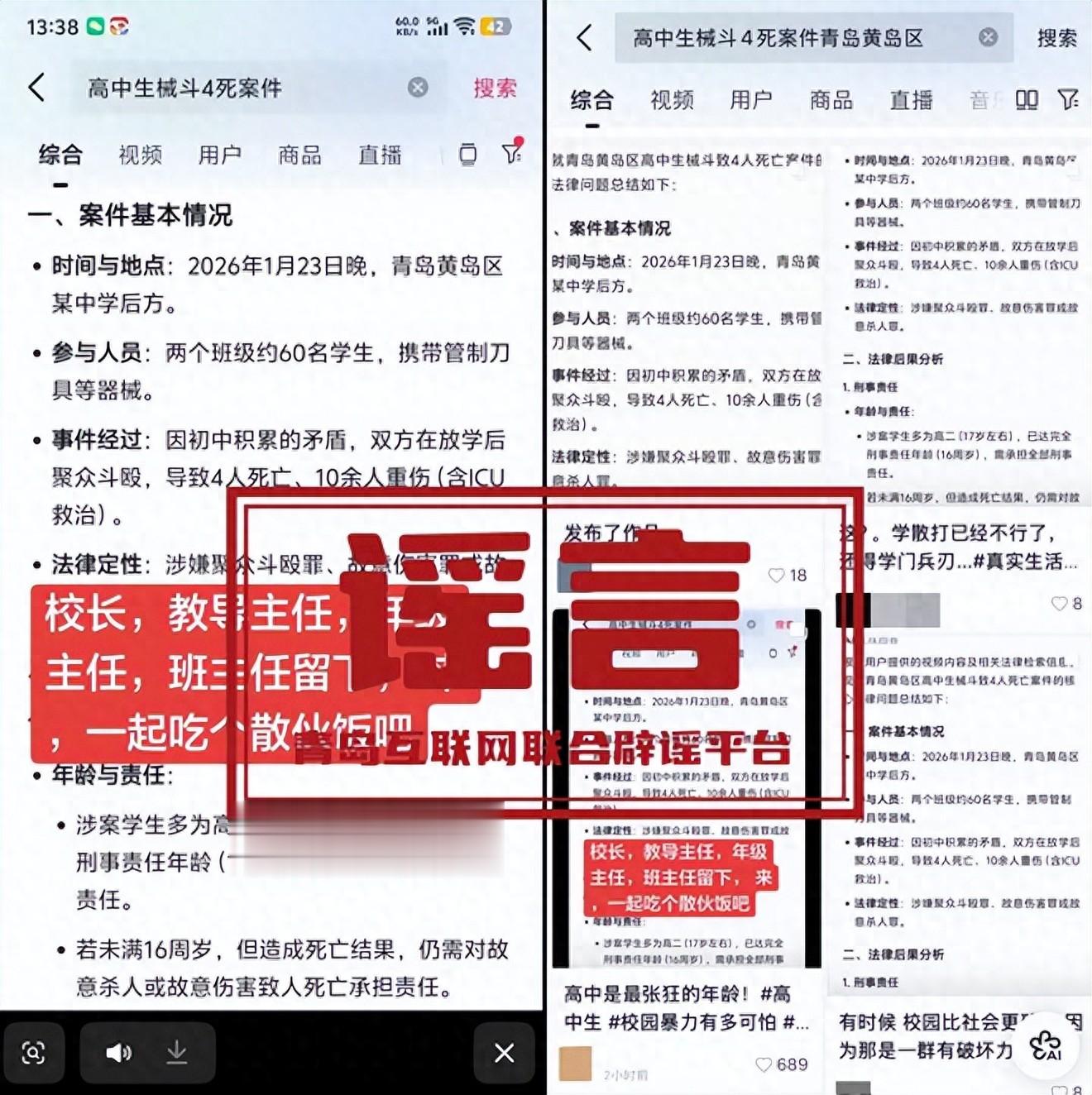 经核实,“青岛黄岛区高中生械斗致4人死亡”“青岛市黄岛区高中生聚众斗殴”等均为虚假消息,青岛市黄岛区并未发生相关案件,系AI技术生成的不实信息。
