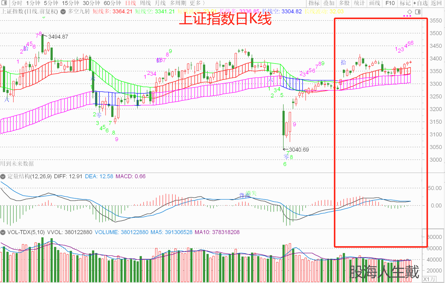 从下周开始,A股可能会进入抉择期,上证指数如果收于3403点,会出现日线级别的顶部背离,要么加速上升顶部背离消失,要么缓速上升后形成顶部结构向下调整。同时需要关注的是,上证指数九转序列运行到数字6,会不会出现顶部背离+九转序列9而引发调整。