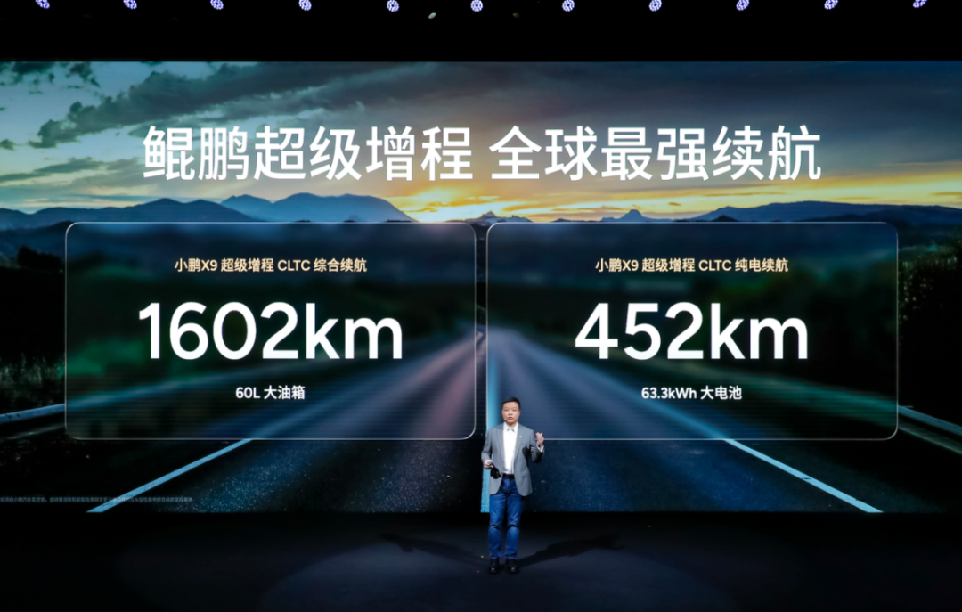 首款搭载鲲鹏超级增程技术的车型——小鹏X9超级增程,配备63.3kWh超快充磷酸铁锂大电池+60L大油箱,实现CLTC纯电续航452km、CLTC综合续航1602km的领先水平,是全球纯电以及综合续航最长的大七座车型。