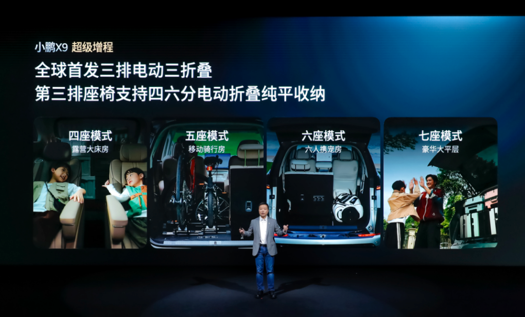 舒适性与便利性配置方面,小鹏X9超级增程配备二排零重力座椅,带来全方位安全防护与极致舒适体验,三排座椅则采用全球首发的电动三折叠技术,支持多种收纳方式,满足不同出行场景需求。
