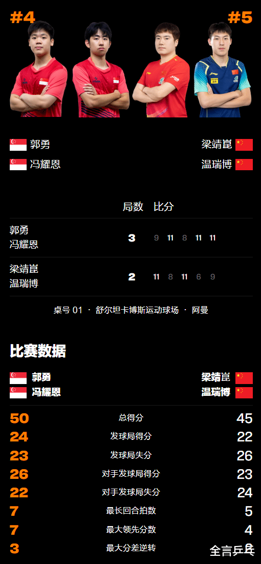 2026年1月21日,乒乓球WTT马斯喀特常规赛再次上演5局大战,国乒世界冠军梁靖崑在自己的首秀中搭档18岁小将温瑞博出场,迎战去年打败过他俩的新加坡组合冯耀恩/郭勇,结果上次2-3败北的梁靖崑/温瑞博又2-3被淘汰止步16强,梁靖崑由此而在新年两站国际赛事中男双一轮游,本站比赛则是首战告负,详细战况请看下文。