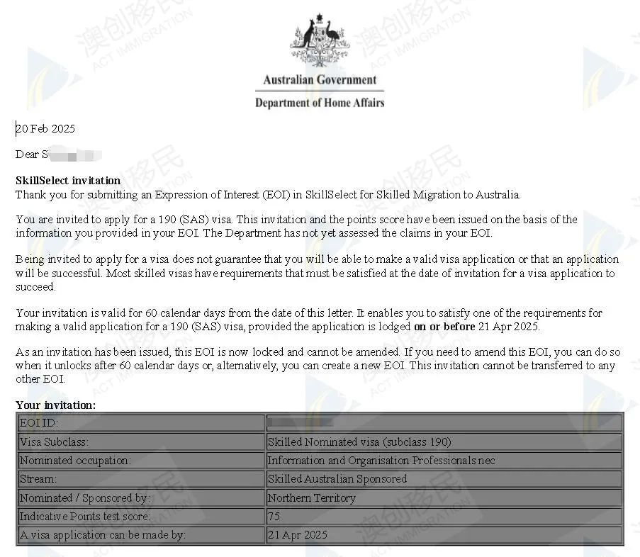 2023年下旬,签约准备常规类技术移民申请;2023年底,顺利拿到澳洲职业技术评估结果;2024年上旬,由于技术移民获邀分数水涨船高,而S女士只考虑190永居签证,于是决定走北领地MINT项目;2024年11月,获得北领地州政府预批;2025年2月中旬,通过资金审核;2025年2月20日,获得北领地 190州担保;