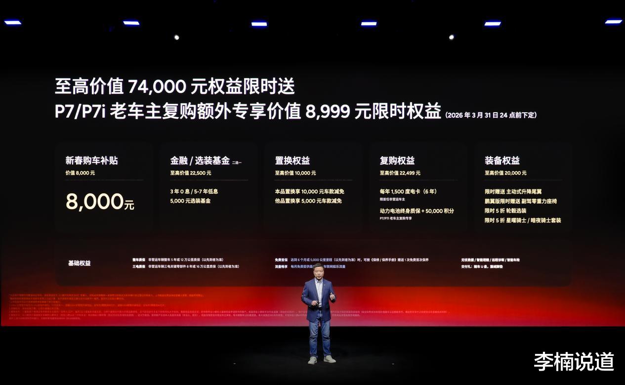 即日起至2026年3月31日24点前下定小鹏P7,用户可享受至高74,000元的配置限时送权益,包括价值8,000元的新春购车补贴,并可二选一享受5,000元选装基金,或3年0息/5-7年低息的金融购车权益;同时,置换用户可获至高10,000元置换权益,复购用户可享至高22,499元复购权益。在外观方面,小鹏提供了至高价值20,000元的装备权益,两款新色套装及轮毂选装的限时半价优惠,主动式升降尾翼限时赠送,购买鹏翼版车型的朋友还可额外获赠副驾零重力座椅。多重礼遇助力用户轻松开启智能出行生活。