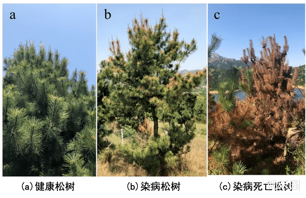 松树感染松材线虫病后,绿叶由于水分输送通道被松材线虫截断,干死的树叶渐渐发出红色。这种病害让松树无药可治,最终导致整片松林死亡。松材线虫病的传播主要依靠松墨天牛等媒介昆虫,这些昆虫在病树上取食后,会将线虫带到健康树上,导致病害迅速蔓延。目前,我国已有多个省份发现松材线虫病的踪迹,防控形势十分严峻。