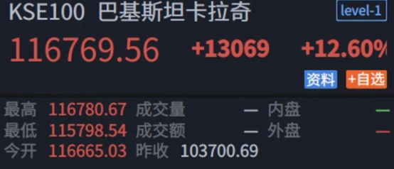 当地时间5月12日,巴基斯坦股市暴涨,目前已暂停交易。暂停交易前,巴基斯坦卡拉奇KSE100指数涨超12%,上涨12949.43点,现报116650.12点;巴基斯坦KSE30指数涨超9%。