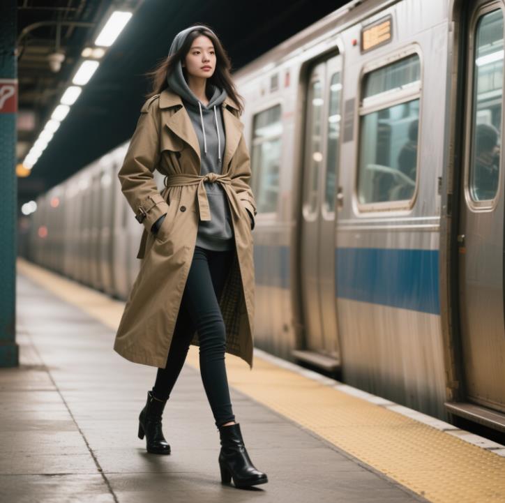 • 上衣:条纹衬衫(最内层,袖口露出卫衣 5cm)+ 藏蓝色连帽卫衣(中间层,帽子露在风衣外)+ 卡其色风衣(最外层,腰带随意系在腰间)