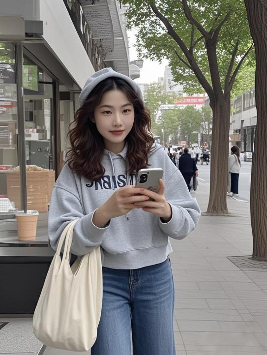 • 上衣:浅蓝色条纹衬衫(解开领口 3 颗扣子,下摆打个松垮结)+ 米白色连帽卫衣(拉低帽子露出衬衫领子和袖口)