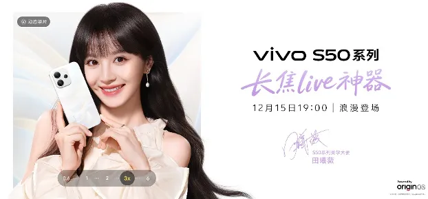 12月8日,vivo S50系列正式官宣:新机将在12月15日19:00发布,田曦薇↓担任“美学大使”。