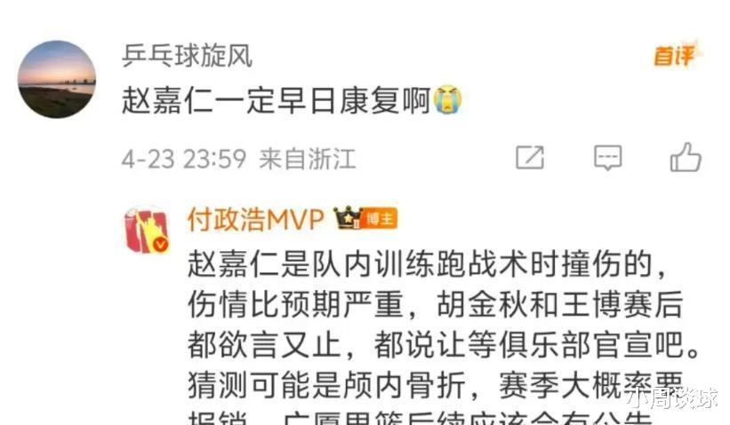 赛后王博指导透露胡金秋和外援奈特的伤病都不是很严重,休息1-2天就可以恢复,基本上不会影响26日主场对阵辽宁队的比赛。至于赵嘉仁的伤病的比较复杂,根据王博指导透露他是在之前的比赛中跑战术、跑配合中受伤;但是也有消息称他是在训练中受伤的,并且是头部受伤相当的严重,大概率是赛季报销了。难怪昨晚上弟弟赵嘉义在比赛中心不在焉,一直没有状态,就连刘维伟指导也一直在安慰赵嘉义,赛后胡金秋和王博提到赵嘉仁更是几度哽咽。