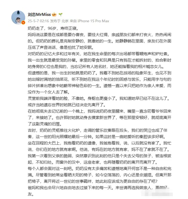 2025年5月7日凌晨,音乐人刘恋在社交平台发布长文悼念离世的96岁祖母。这篇饱含深情的文字迅速登上热搜,引发广泛共鸣。在文字中,刘恋不仅追忆了作为孙女的亲情,更表达了对未能以平视角度了解祖母完整人生的遗憾。