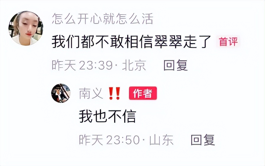 在评论区,南义悲痛回复网友留言,称自己也不相信翠翠走了,好好的一个人,说没就没了,让两个孩子又该如何接受呢?