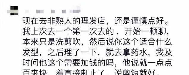 现在去非熟人的理发店,还是谨慎点好。我上次去一个第一次去的,开始一顿聊,本来只是洗剪吹,然后说你这个适合什么发型,之后理了一下,就去拿药水,我及时问他这个需要加钱的吗,他说就一点点百来块,着直接制止了,说剪短就好。