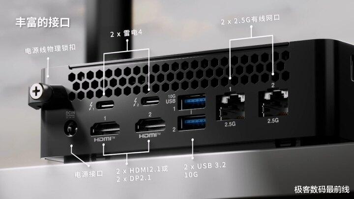 散热与连接性也诚意拉满。机身配备双风扇+多热管散热模组,优化风道设计,即便长时间高负载运行(如视频渲染、AI计算)也能保持稳定性能,同时将噪声压至极低水平;接口配置全面,双2.5G网口满足高速数据传输与企业组网需求,支持Wi-Fi 7与蓝牙6.0,无线传输速率拉满,搭配双雷电4、双HDMI 2.1接口,支持四屏4K同时输出,轻松适配多屏办公、专业设计等场景。