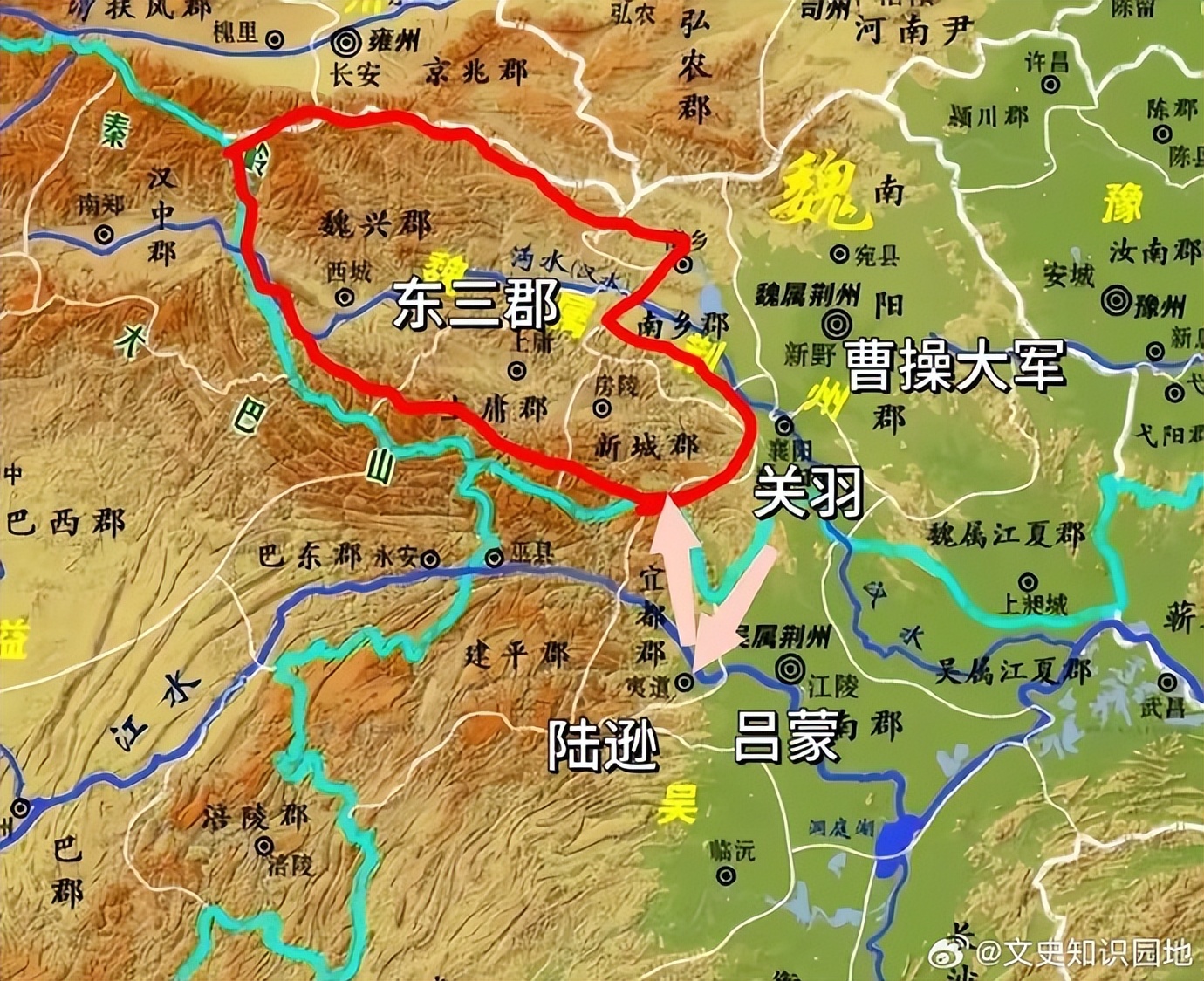 事实上,东三郡就是诸葛亮所说“跨有荆益”的狭长走廊,周围遍布群山,险塞四固,只有两个管口通往外界,一个管口通往汉中,一个管口通往荆北,只要占住汉中和荆北两个管口,东三郡如在囊中,根本不用死死捂着。有些书上说刘封孟达所在东三郡归益州管,不受关羽调遣,但依照我前面分析,东三郡的行政归属早已划到了荆州,而且刘封孟达与关羽几乎同时在东三郡与荆北发动攻势,这显然绝非偶然的巧合,而是刘备实行跨有荆益整体战略的统一安排,他应该在事前就已部署了二人必须配合关羽(刘封被任命为副军将军,这副军二字,就是预备队的意思),只是由于刘备错误的人事安排,让孟达心理失衡,破罐子破摔,这才导致了后来的荆州危机。