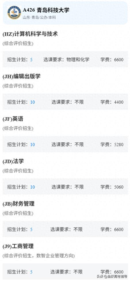 青岛科技大学好就好在它的所有专业都在普通类常规批中有招生,从专业部署上不管是限制物化的理科还是不限的文科都有一些不错的专业。就这一点上,青岛科技的综评还算是非常良心的!