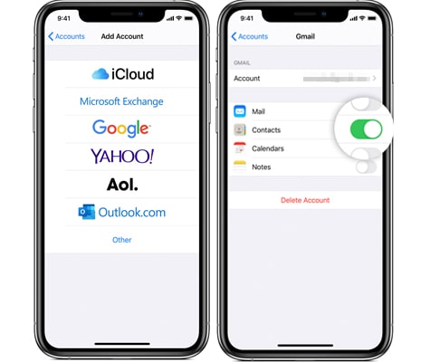 第五步:点击“帐户”,然后点击“添加帐户”,选择“Google”,并使用同一帐户登录。启用“通讯录”选项,您的 Google 联系人将自动同步到 iPhone。