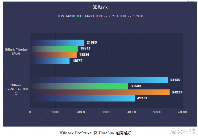 下面进行的是3DMark基础性能测试,分别测试了TimeSpy和FireStrike的CPU分数,由于这代英特尔酷睿Ultra 200S处理器架构设计线程数的减少,在部分TimeSpy的测试中处理器的分数要略低于上代,但是在FireStrke的测试中,CPU的分数要略高与上代。