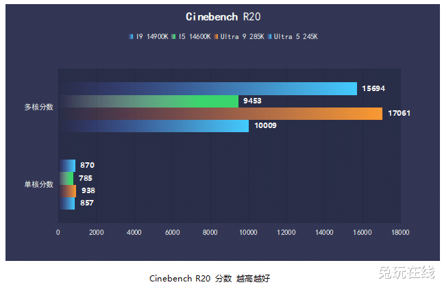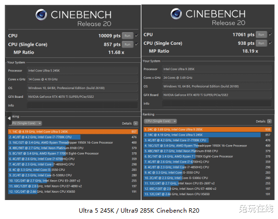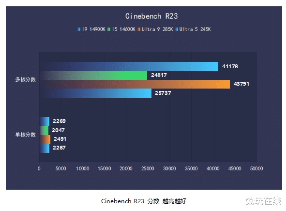 在CPU-Z和Cinebench R20、R23的基准测试中,Intel Ultra 9285K在多核性能上明显领先,而单核性能则与前代基本保持一致。总体来看,效能核心的架构优化在多线程任务中的表现更为出色。