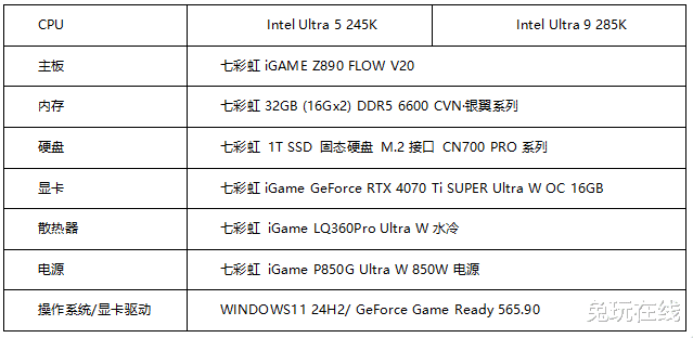 本次的测试平台使用的是七彩虹品牌,主板是最新的iGame Z890 FLOW,因为这一代INTEL 酷睿Ultra处理器采用了全新的LGA1851插槽接口,所以大家在配置的时候也要选择Z890系列的主板,iGame Z890 FLOW这块主板采用了20+1+1+1相强供电,90A高规格DrMos,可以很好的支持Intel第二代酷睿Ultra处理器发挥其性能;显卡方面使用的是七彩虹RTX 4070 Ti SUPER 16GB,内存是七彩虹32GB(16GBx2)的DDR5 6600,硬盘是M.2 SSD 1T的CN700 PRO系列,电源方面搭配了850W的金牌全模组电源。