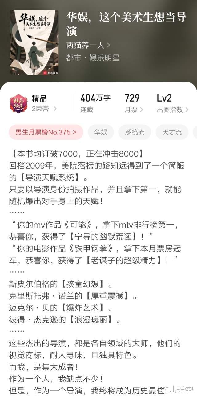 两猫养一人的《华娱,这个美术生想当导演》,小说去年2月10号开始连载,写了一年一个月这样。