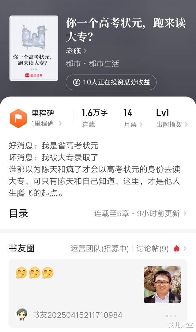 翻起点新书榜的时候,突然看到有个“老施”发了新书《你一个高考状元,跑来读大专?》。
