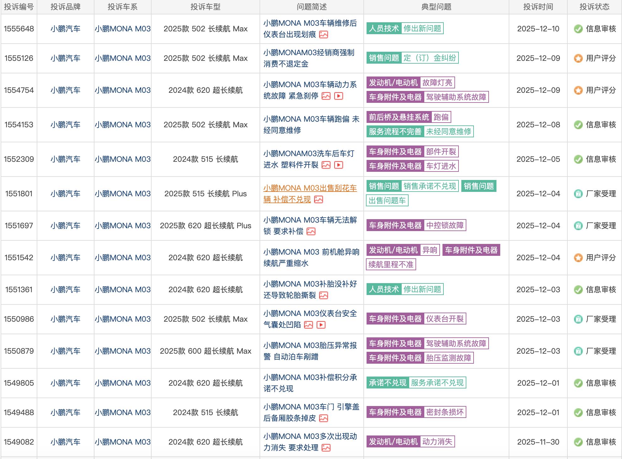 在刚刚过去的11月份,小鹏汽车2025年11月销量为36,728台,同比增长19%,但环比下降12.58%,目前小鹏在售的新车有7款,其实是平均到每个车型上并不算多,而且现在小鹏MONA M03的投诉量过多,主要集中在产品质量问题上。