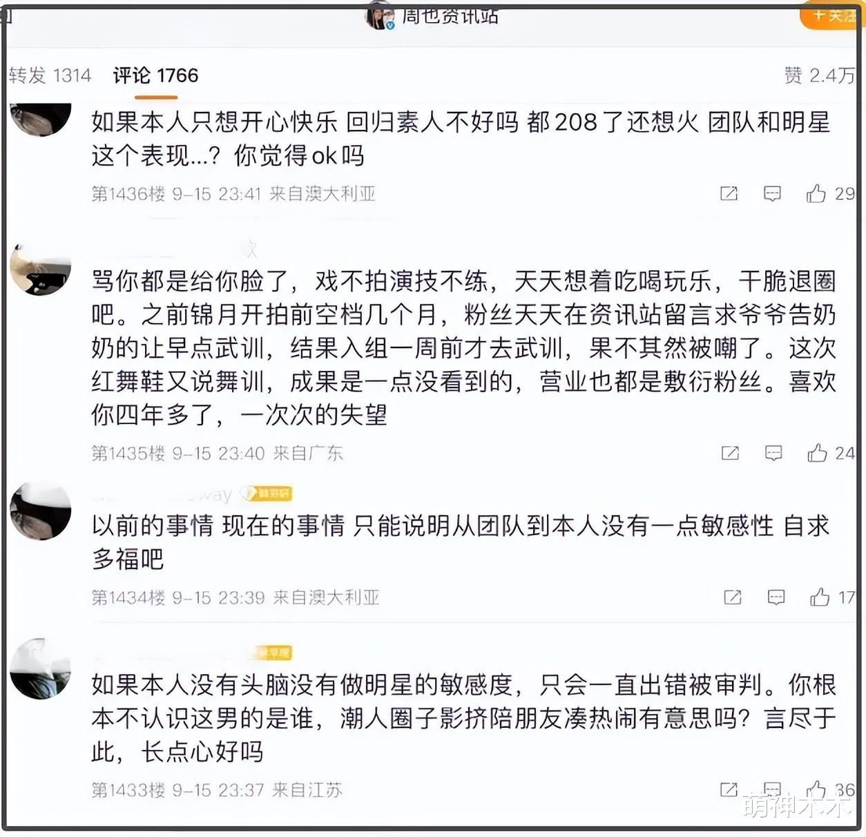 周也和工作室的评论区都已经沦陷了,不少粉丝都认为周也和团队都没有敏感度,看演唱会可以,但是也不是谁的演唱会都能去的,目前周也对此也没有回应。