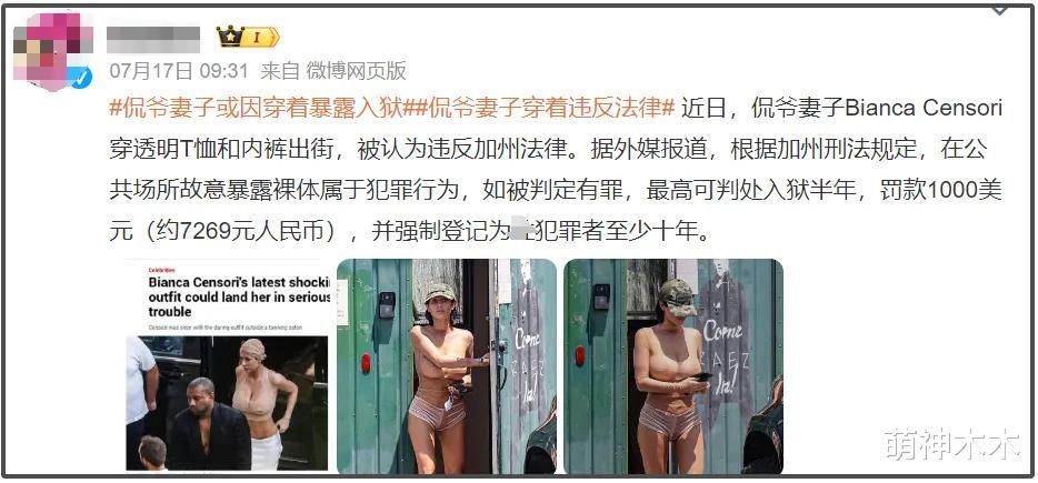 侃爷妻子曾因为着装问题被曝违法,有媒体称这种着装暴露的行为很可能会引起牢狱之灾,但侃爷还是每次都这样打扮妻子,不少网友觉得侃爷这样做很不尊重女性,但他也并没有意识到问题。