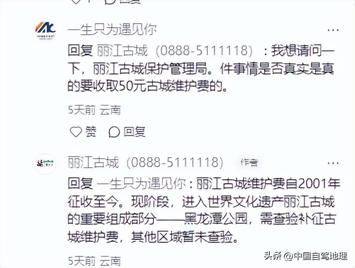 “丽江古城维护费自2001年征收至今。现阶段,进入世界文化遗产丽江古城的重要组成部分——黑龙潭公园,需查验补征古城维护费,其他区域暂未查验。”丽江古城官方在小红书上的正面回应。