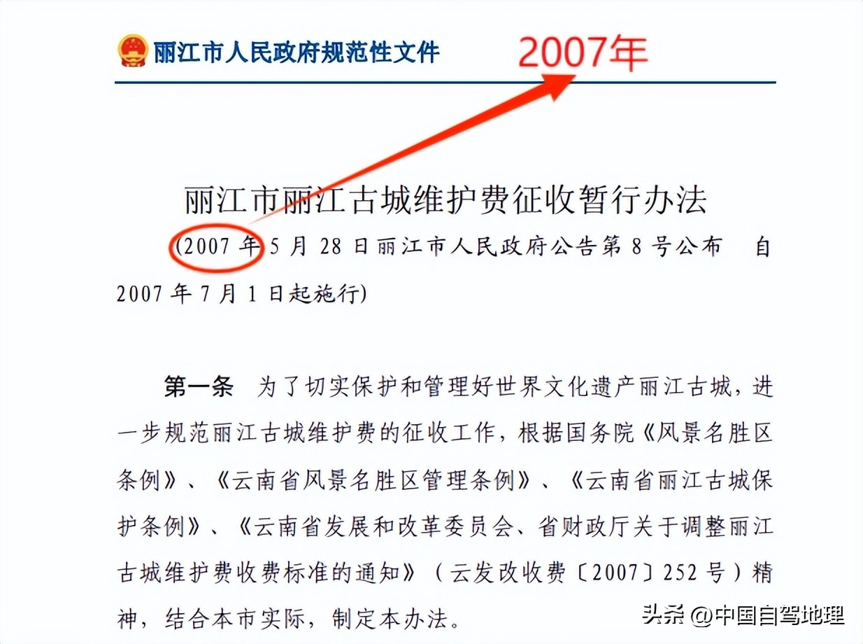 1、冷知识:“古维费”已收24年各位在开怼之前,必须要先搞清楚,这次官方所发布的《丽江市丽江古城维护费征收管理办法》,不是新规,而是自2007年(正式出台),乃至2001年就已经开始了。