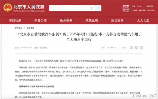 去年12月31日,北京市正式推出自动驾驶汽车条例。条例明确L3级别的自动驾驶正式落地实施,并于4月1号执行,这次把小型乘用车也纳入其中。