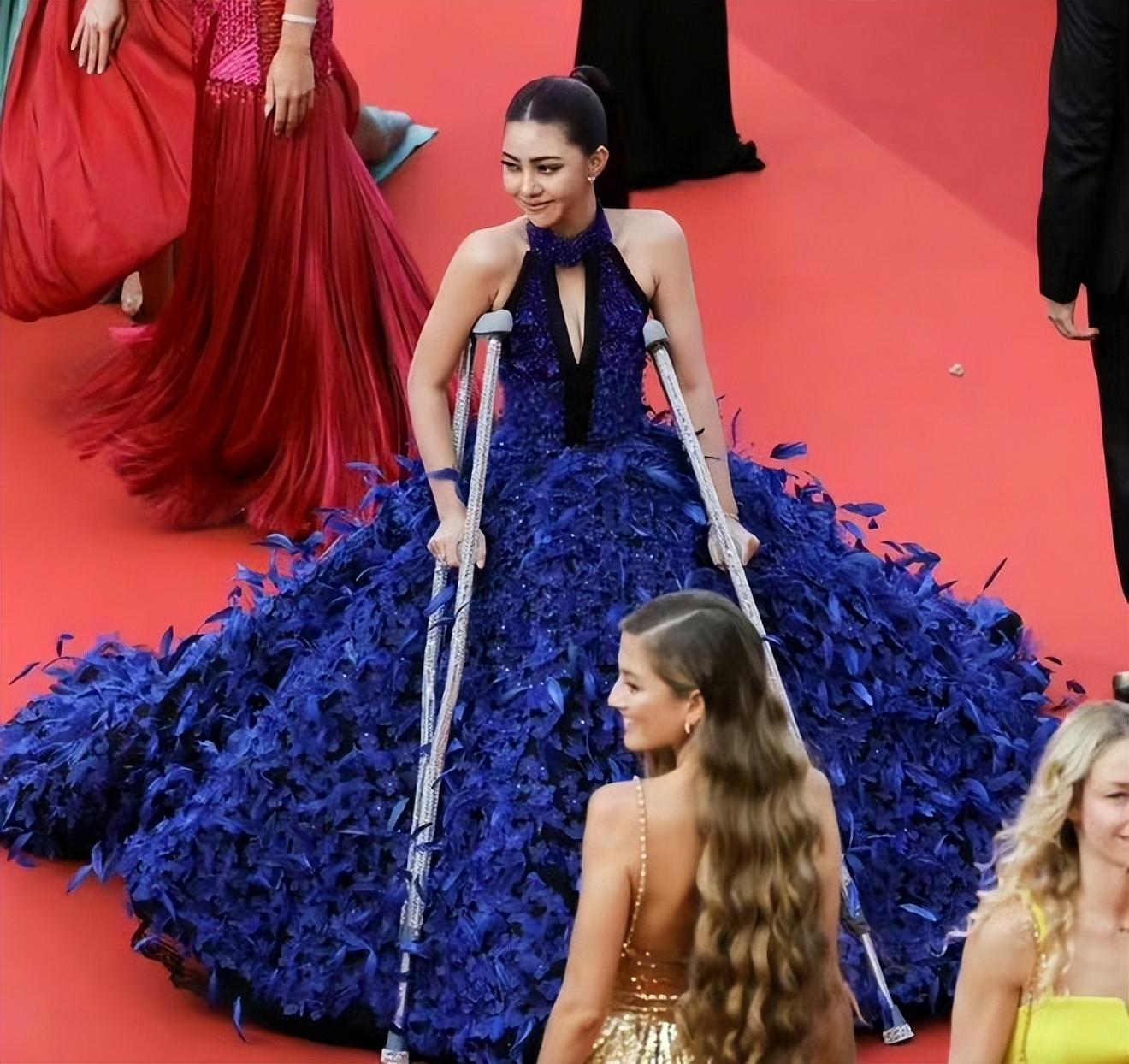 即使是身体受伤也不想放过这次展示自己的机会,一位名叫申玉斌的柬埔寨女星,腿部受伤无法行走,但是仍然要来戛纳凑热闹。穿着蓝色礼服,手拄镶钻拐杖,在红毯上赚足了眼球。我们内娱明星也不例外,为了在这场盛会中展现自己,提高自己在海外的人气,也是整出了一堆话题。