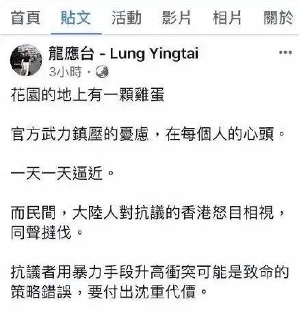 2019年9月4日,龙应台在社交媒体上发表了一段长文,其中更是用“鸡蛋”来形容香港年轻人“以卵击石”的悲情。