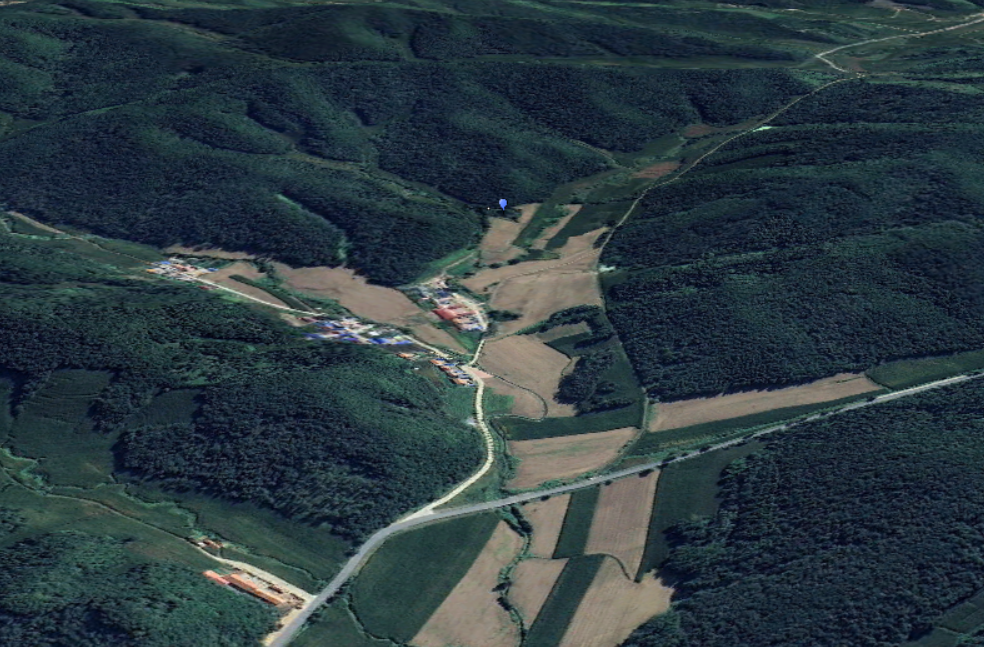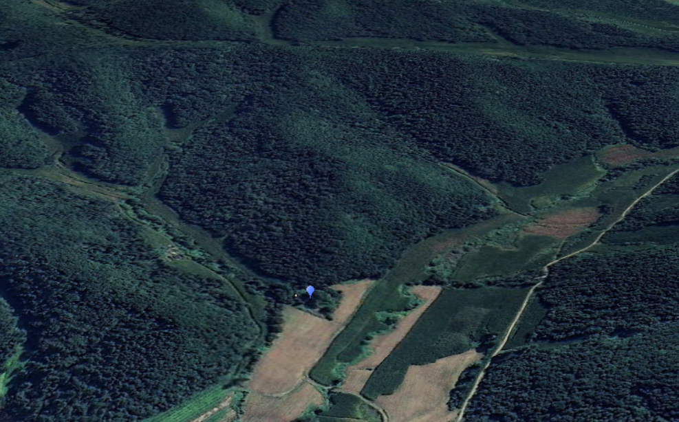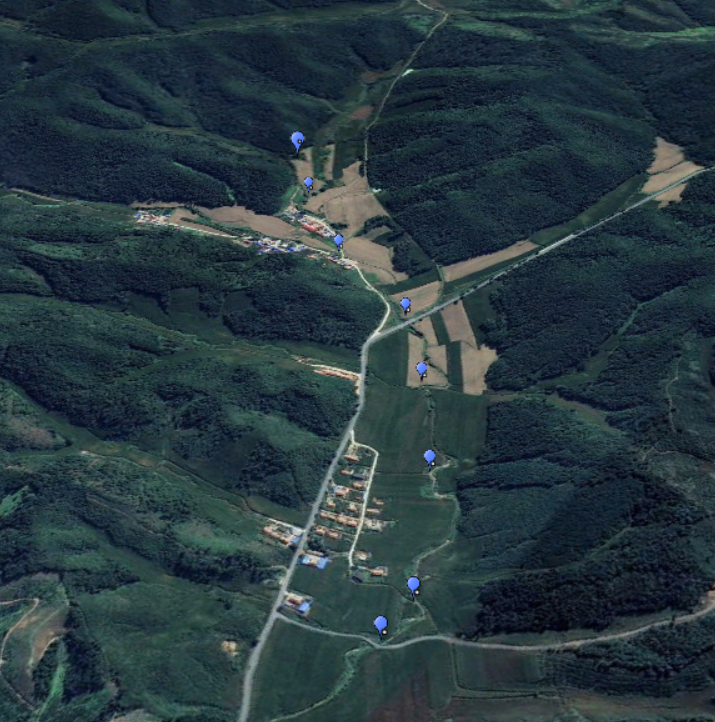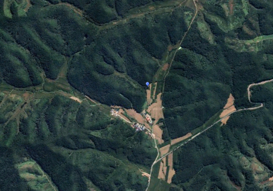 最上面标点是其祖坟处。其余小点都是小河沟交汇处。再往外一公里多是一个大湖。从其祖先墓地到湖的直线距离是三公里。