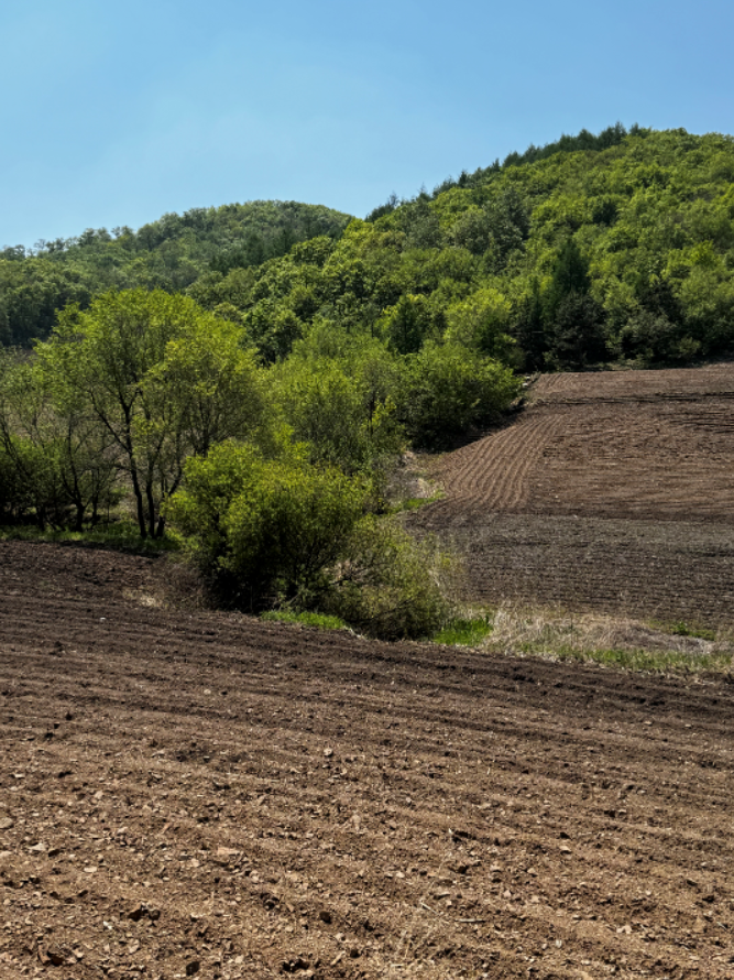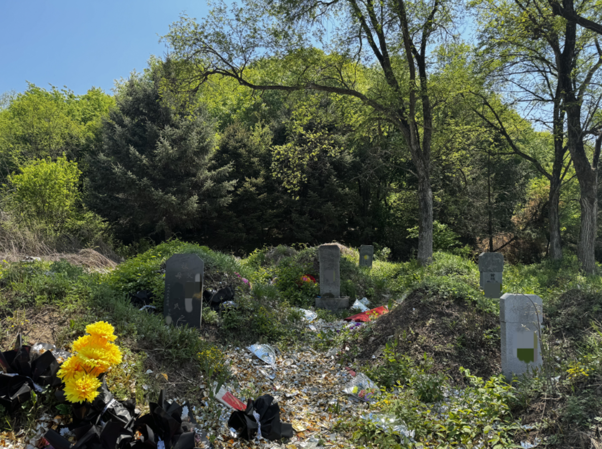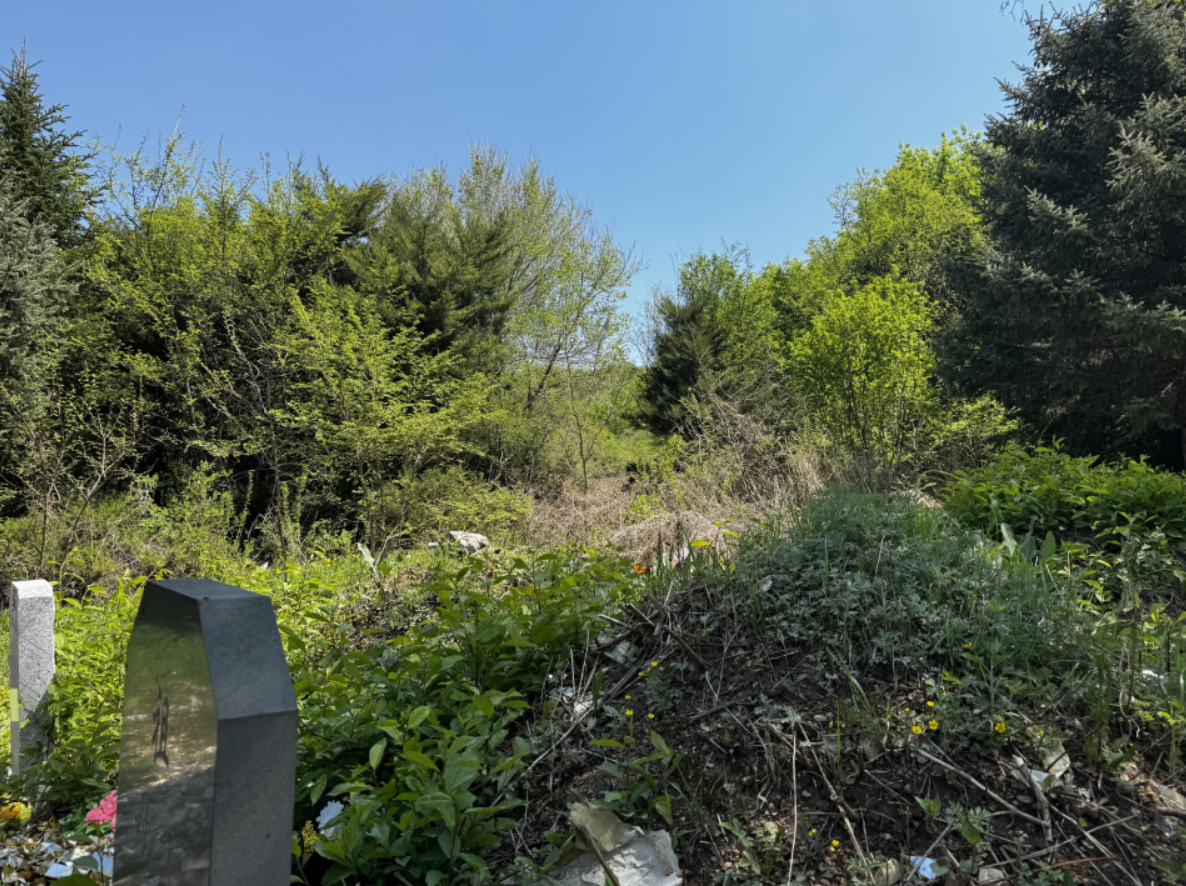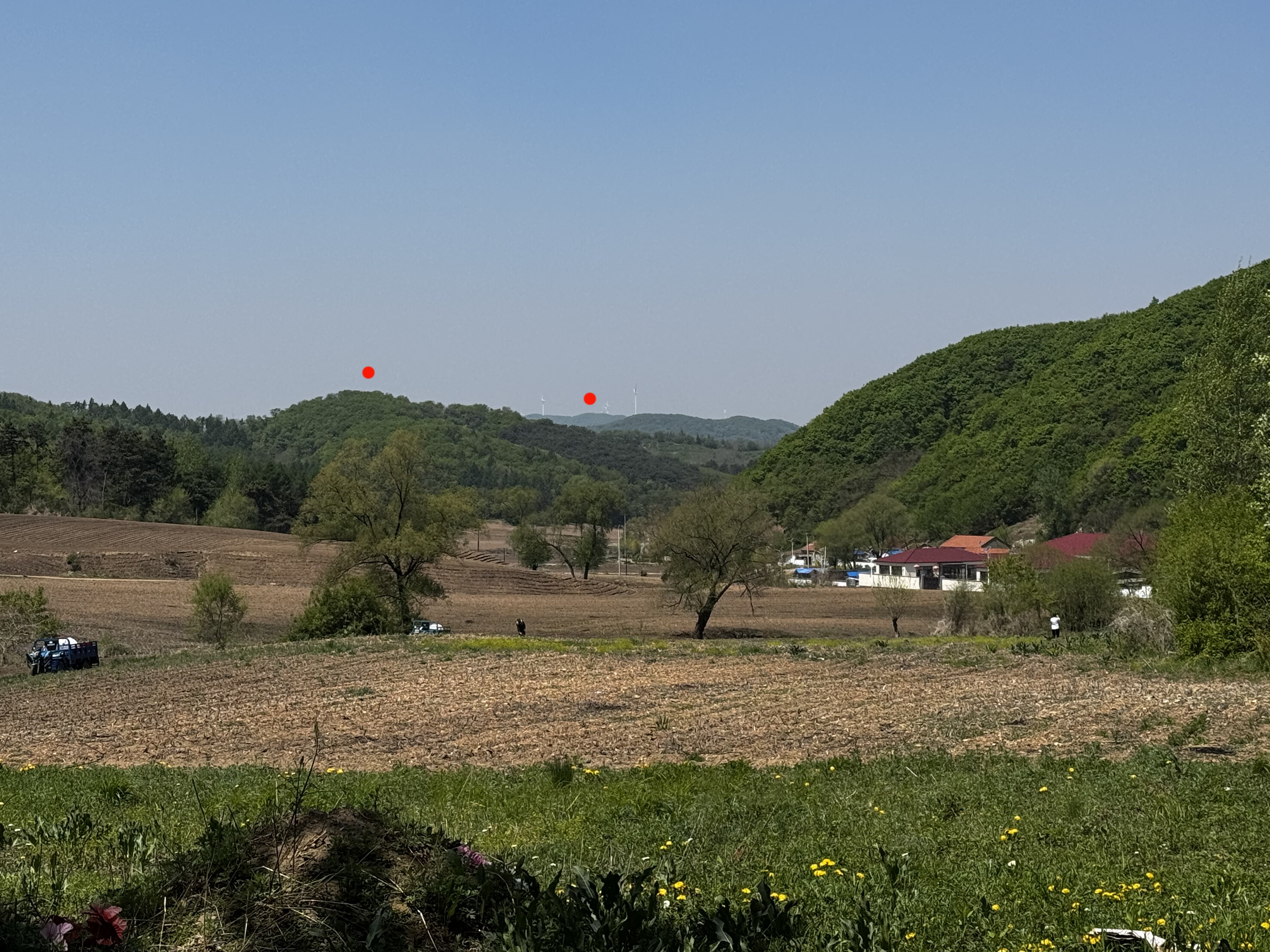 标了两个红点,其曾祖父母墓朝向右边红点,其祖父母墓朝向左边红点。其先祖墓朝向还要左偏很多。其父母墓没有立碑,自然朝向,大致两红点之间,可能更靠近右边红点。