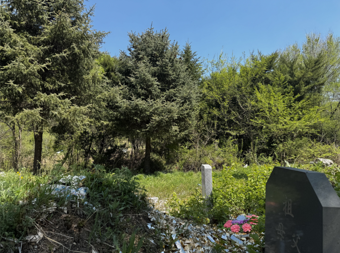 左边墓碑是其祖父母的,中间是曾祖父母,再后面是其先祖。可以看见后山形状是比较圆的,可结合前面图一起看。