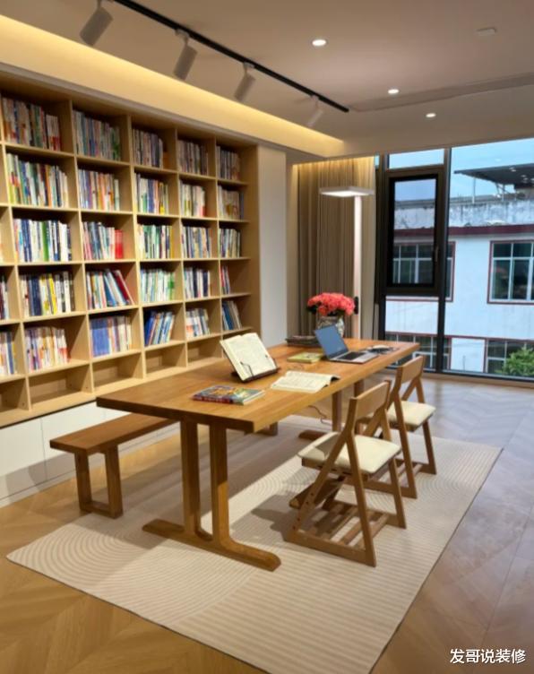 他们直接放弃电视墙,靠窗那一面做了整排定制书柜,孩子的书、本子、玩具都能收得整整齐齐。中间摆一张原木长桌——这一张桌子可厉害了,吃饭、写作业、办公、手工、画画都能搞定。她笑着说:“白天办公区、晚上家庭影院,一张桌子顶半个家。”
